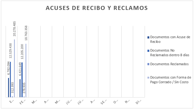 | Mes | Documentos con Acuse de Recibo | Documentos No Reclamados dentro 8 días | Documentos Reclamados | Documentos con Forma de Pago Contado / Sin Costo |