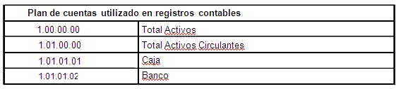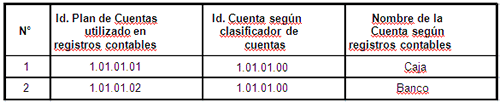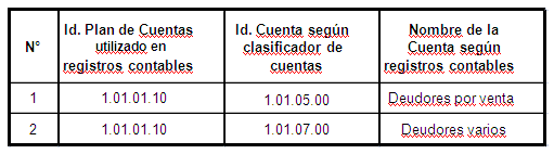 Cuando el nivel de detalle de sus registros contables sea menor a la codificación propuesta en Anexo N°1 (para cada tipo de cuenta en particular que se desee clasificar, deberá repetir, en la columna “Id plan de cuentas utilizado en registros contables”, el código utilizado en sus registros contables, tantas veces como sea necesario, según el código indicado en anexo, columna “Id. Cuentas según clasificador de cuentas”, es decir, en el plan de cuentas utilizado por el contribuyente, deudores por venta y deudores varios utilizan el mismo código, conforme se ilustra en el siguiente ejemplo: