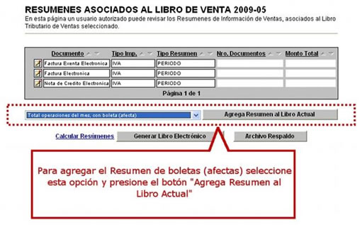 Seleccione el tipo de resumen que se desea agregar y luego presione "Agrega Resumen al Libro Actual", por ejemplo en la pantalla aparece "Total operaciones del mes, con boleta (afecta)”.