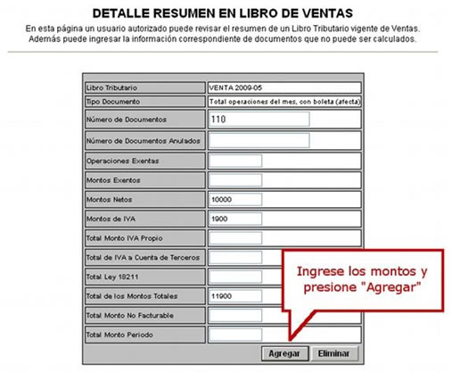 El siguiente paso es digitar los datos del resumen que se está agregando, en este caso las cantidades y los montos involucrados por concepto de ventas con boleta.