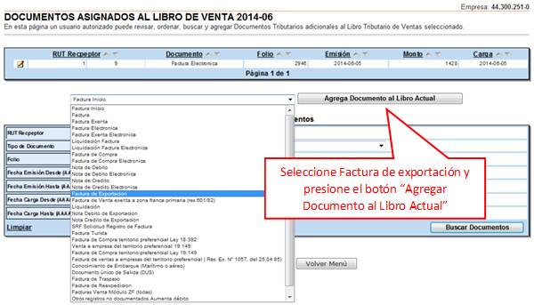 Seleccione el tipo de documento y luego presione el botón "Agrega Documento al Libro Actual", en este caso se seleccionará el tipo de documento “Factura de Exportación”.