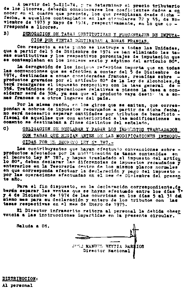 CIRCULAR Nº126 DEL 30 DE DICIEMBRE DE 1974 MATERIA : LICORES. DA A CONOCER MODIFICACIONES DEL ARTÍCULO 80º DE LA LEY DE ALCOHOLES, INTRODUCIDAS POR D.L. Nº 787, DE 5-XII-74 E IMPARTE INSTRUCCIONES .