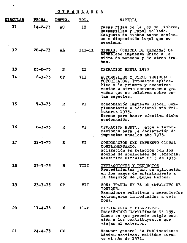 CIRCULAR Nš17 DEL 24 DE ENERO DE 1974 MATERIA : RESUMEN GENERAL DE PUBLICACIONES ADMINISTRATIVAS, EMITIDAS DURANTE EL AŅO DE 1973.