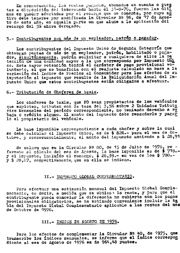 CIRCULAR Nº105 DEL 10 DE SEPTIEMBRE DE 1976 MATERIA : IMPUESTO ÚNICO DE SEGUNDA CATEGORÍA Y GLOBAL COMPLEMENTARIO. MONTO DE LA UNIDAD TRIBUTARIA Y TABLAS DE IMPUESTOS PARA EL MES DE OCTUBRE DE 1976. ÍNDICE DEL MES DE AGOSTO DE 1976.