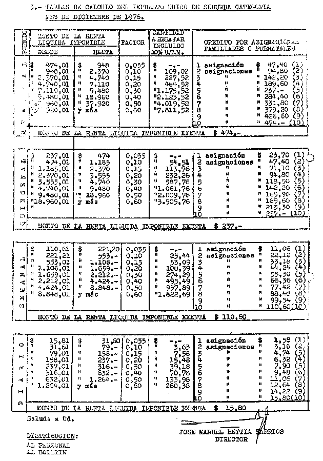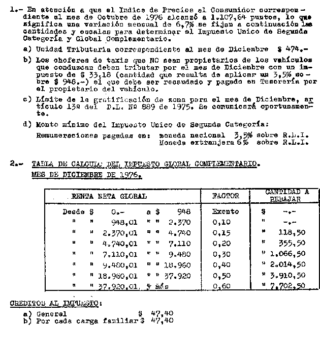 CIRCULAR Nº133 DEL 15 DE NOVIEMBRE DE 1976 MATERIA : IMPUESTO ÚNICO DE SEGUNDA CATEGORÍA Y GLOBAL COMPLEMENTARIO. MONTO DE LA UNIDAD TRIBUTARIA Y TABLAS DE IMPUESTOS PARA EL MES DE DICIEMBRE DE 1976. ÍNDICE DEL MES DE OCTUBRE DE 1976.