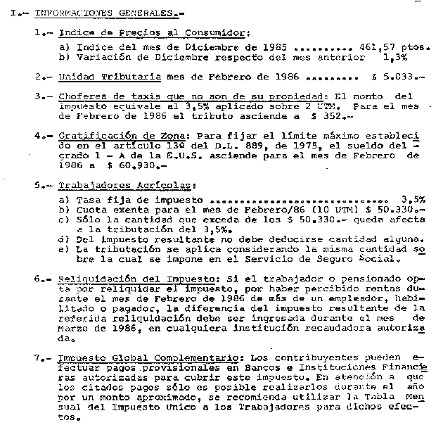 CIRCULAR Nº5 DEL 10 DE ENERO DE 1986 MATERIA : IMPUESTO ÚNICO DE SEGUNDA CATEGORÍA. MONTO DE LA UNIDAD TRIBUTARIA. TABLAS DE IMPUESTO PARA EL MES DE FEBRERO DE 1986.