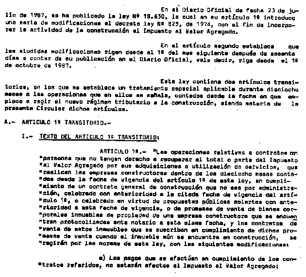 CIRCULAR Nº24 DEL 24 DE JULIO DE 1987 MATERIA : INSTRUCCIONES SOBRE LAS NORMAS TRANSITORIAS DE LA LEY QUE INCORPORE LA ACTIVIDAD DE LA CONSTRUCCIÓN AL IMPUESTO AL VALOR AGREGADO.