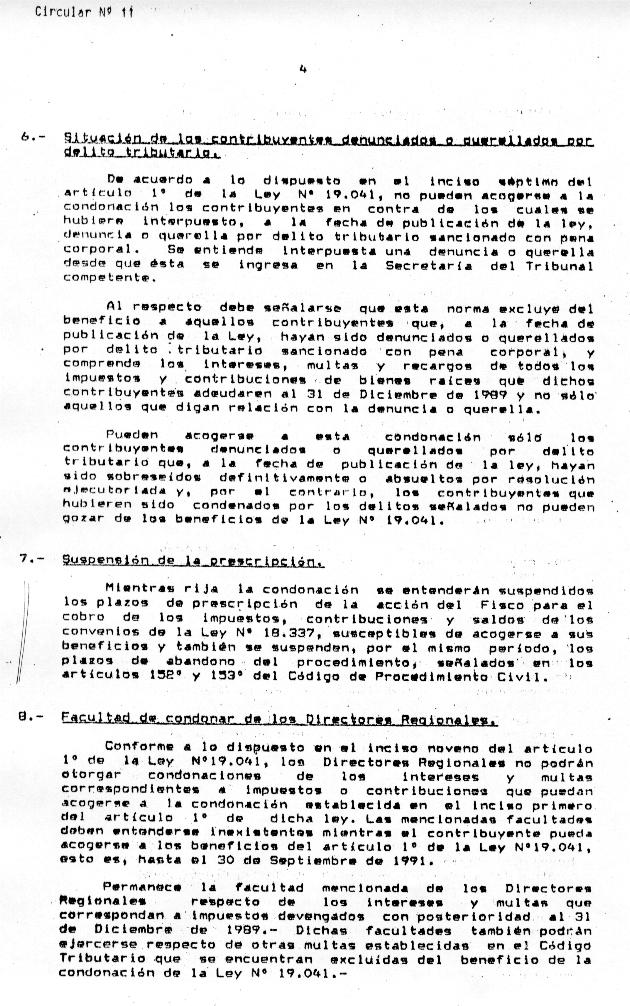 | Home > Circulares 1991 [1], [2] CIRCULAR Nº 11 DEL 15 DE FEBRERO DE 1991 MATERIA: IMPARTE INSTRUCCIONES SOBRE LAS NORMAS DE LA LEY N°19.041, RELATIVAS A CONDONACION DE INTERESES Y MULTAS POR ATRASO EN LA DECLARACION O PAGO DE IMPUESTOS FISCALES Y CONTRIBUCIONES DE BIENES RAICES SOBRE PRESCRIPCION DE ESTOS TRIBUTOS Y SUS CARGOS |