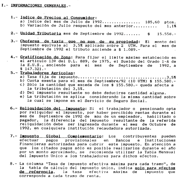 MATERIA: IMPUESTO UNICO DE SEGUNDA CATEGORÍA - MONTO DE LA UNIDAD TRIBUTARIA - TABLAS DE IMPUESTOS PARA EL MES DE SEPTIEMBRE DE 1992