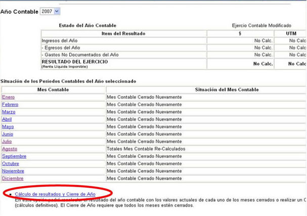 Una vez cerrados todos los meses respectivos, es posible usar la opción “Cálculo de resultados y Cierre de Año”. Al seleccionar esta opción, el año queda en estado “Totales Ejercicio Contable Calculados”.