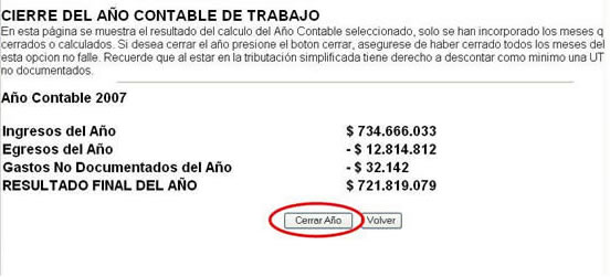 Al acceder a esta página, el sistema muestra la Base Imponible o Pérdida Tributaria del año. Para ello, considera lo siguiente: todos los ingresos registrados mensualmente, todos los egresos registrados mensualmente y todos los Gastos no documentados anotados al cierre de cada mes. Al momento del Cierre Anual, el sistema valida que el total de Gastos no documentados ingresados no sea menor a 1 UTM y que no exceda las 15 UTM o el 0,5% de los ingresos del ejercicio (el menor valor entre ambos), según lo establece el Artículo 14 ter de la LIR. Para ello, se considera la UTM vigente al cierre del ejercicio (en el caso del ejemplo es de la UTM de Enero del 2007 que era de $32.142).
