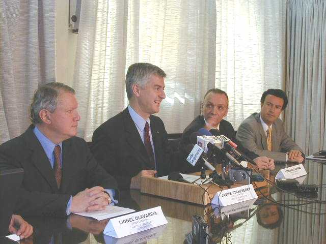 El Director del SII acompañado por los Gerentes Generales del Banco del Estado, BCI y de Santiago, durante la conferencia de prensa de esta mañana