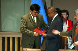 El director del SII, Juan Toro, recibe de manos del subsecretario general de la ONU, Nitin Desai, el certificado que acredita que el SII ganó el "Premio Servicio Público de las Naciones Unidas" en la categoría “Innovaciones en el servicio público” por la propuesta de declaración de impuestos a la renta".