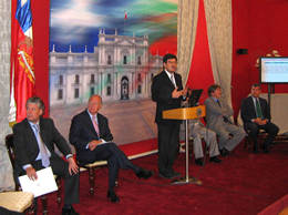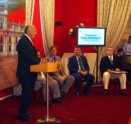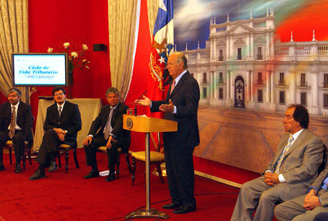 El Presidente Ricardo Lagos destacó el positivo impacto que las facilidades para el cumplimiento tributario desarrolladas por el SII, pueden significar para las Mipyme: "Hoy día, cuando tanto se habla sobre lo mucho que hay que hacer para mejorar la situación de las micro y pequeñas empresas, bueno, aquí se está trabajando concretamente cómo se hace para mejorar situación de la pequeña empresa", dijo. En la foto, junto al Presidente y de izquierda a derecha, el subsecretario de Economía, Carlos Alvarez, el director del SII, Juan Toro, el ministro de Hacienda,