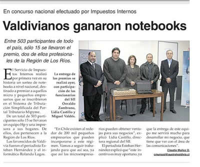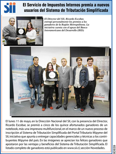 Con mucha alegría 15 empresarios de todo el país recibieron el notebook e impresora que ganaron por haberse inscrito entre enero y abril de 2009 en el Sistema de Tributación Simplificada del Portal Tributario Mipyme del Servicio de Impuestos Internos (SII). Los computadores fueron sorteados a principios de mayo, en el marco de una campaña de estímulo para promover y reconocer la inscripción de micro y pequeños empresarios al sistema.