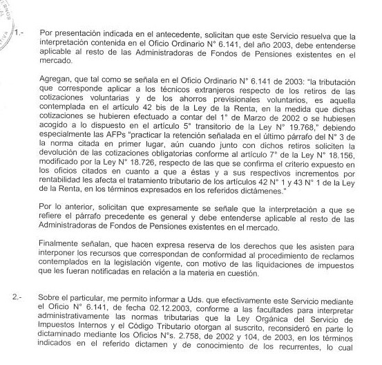 LEY DE IMPUESTO A LA RENTA. ARTICULOS 42 N°1, 42 bis 43 N° 1. ORDINARIO N° 1480, DE 29 DE MARZO 2004.- Ratifica criterio expresado en Oficio que indica sobre tratamiento tributario que afecta a la devolución de fondos previsionales efectuados a los trabajadores técnicos extranjeros, estableciendo que es de aplicación general para la industria de AFP.