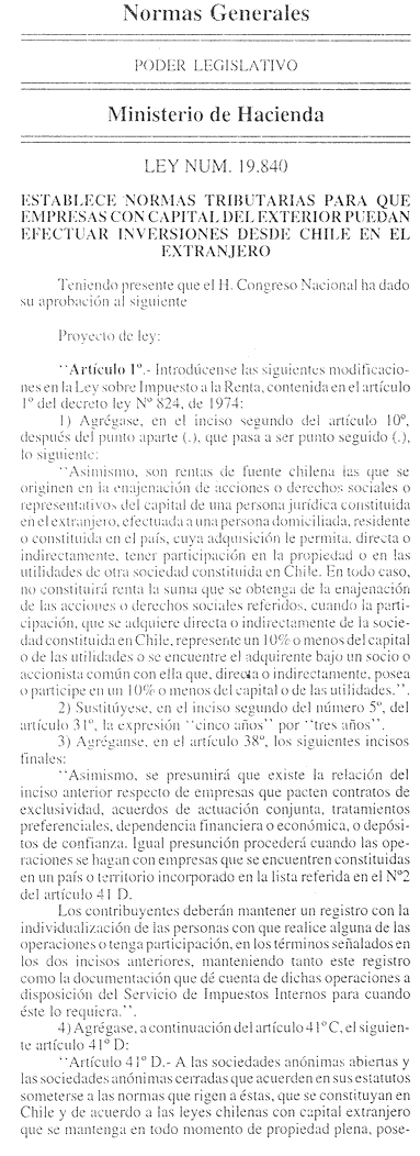 LEY NUM. 19.840. ESTABLECE NORMAS TRIBUTARIAS PARA QUE EMPRESAS CON CAPITAL DEL EXTERIOR PUEDAN EFECTUAR INVERSIONES DESDE CHILE EN EL EXTRANJERO