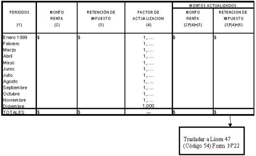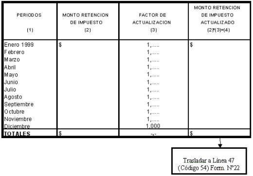 | (C) Si el contribuyente en el presente Año Tributario 2000, tiene derecho a rebajar un sólo tipo de retenciones, cualquiera de ellas, su valor, además de registrarlo en los Códigos (198) ó (54) de la línea 47, según corresponda, deberán anotarlo en el Código (611) de la citada línea para los efectos de su imputación a los Impuestos Anuales a la Renta que afectan al contribuyente declarante o solicitar la devolución de los eventuales excedentes que pudieran producirse. Ahora bien, si el referido contribuyente en el citado año tributario tiene derecho a rebajar ambos tipos de retenciones, junto con anotarlas en los Códigos pertinentes de la línea 47, deberá sumar dichos valores, y el resultado obtenido registrarlo en el Código (611) para los mismos fines antes indicados. |