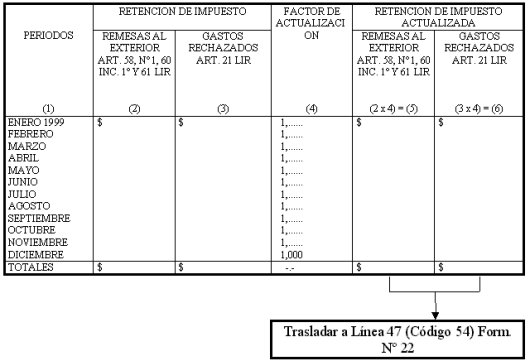 MODELO DE CERTIFICADO Nº 14, SOBRE RETENCIONES DE IMPUESTO ADICIONAL EFECTUADAS CONFORME AL ARTICULO 74 Nº 4 DE LA LEY DE LA RENTA Razón Social empresa o sociedad.........RUT. Nº................................. Dirección............................... Giro o Actividad........................ CERTIFICADO SOBRE RETENCIONES DE IMPUESTO ADICIONAL EFECTUADAS CONFORME AL ARTICULO 74 Nº 4 DE LA LEY DE LA RENTA CERTIFICADO Nº ............... Ciudad y fecha................ La empresa o sociedad .................................................., certifica que al Sr............................... Rut. Nº....................., durante el año 1999, sobre las rentas remesadas al exterior y gastos rechazados del artículo 21 de la Ley de la Renta, determinados al término del ejercicio, se le han practicado las retenciones de impuesto Adicional que se señalan, conforme a lo dispuesto por el artículo 74 Nº 4 de la ley antes mencionada: |
