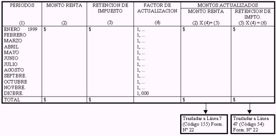 (5) Los contribuyentes que deben declarar rentas en esta línea 7 o pérdidas en la línea 12, y que no se trate de aquellos ingresos que se acreditan mediante los certificados indicados en los números anteriores, al término de cada ejercicio comercial deberán confeccionar una planilla con el detalle de las mencionadas rentas o valores negativos, según sea el tipo de impuesto que las afecte, conteniendo como mínimo la información que se indica a continuación. Este documento lo deberán mantener en su poder y a disposición de las Unidades del Servicio de Impuestos Internos cuando éstas lo requieran, al igual que los certificados señalados anteriormente. |