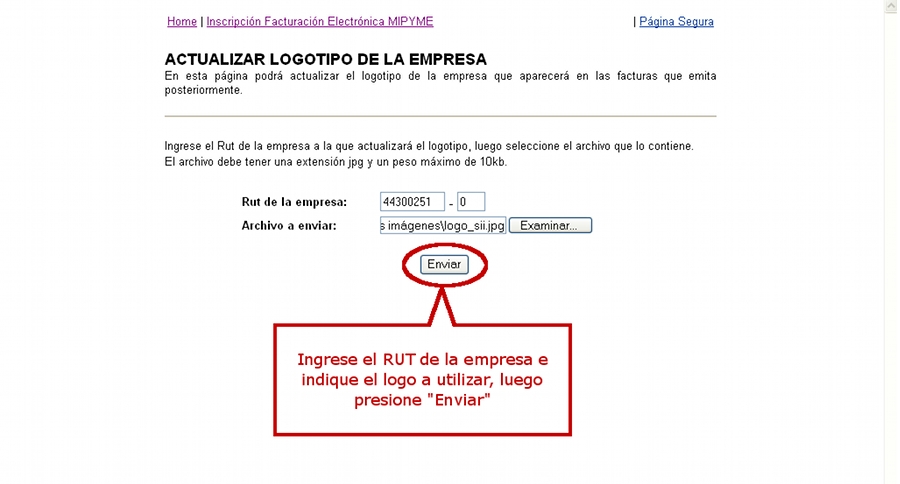 | En esta pantalla, Usted deberá ingresar el RUT de la empresa, indicar la imagen que desea utilizar como logo y posteriormente presionar el botón Enviar. |