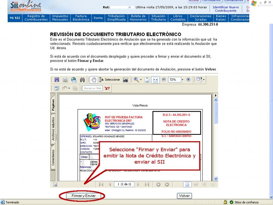 La Nota de Crédito Electrónica que anula el Documento Tributario Electrónico ha sido generada, firmada y enviada al SII.. (Ver imagen) |