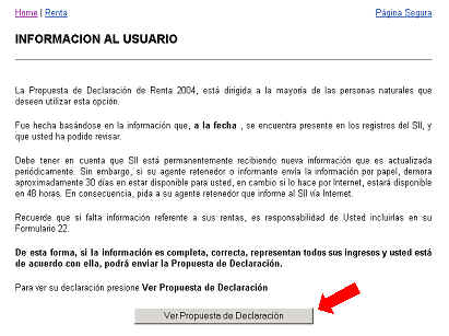 Después de seleccionar el botón "Continuar" en la página de Resumen de sus ingresos usted ingresará a una página titulada Información al usuario, la cual contiene información que debe leer antes de continuar. Luego seleccione el botón Ver Propuesta de Declaración ubicado al final de la página.