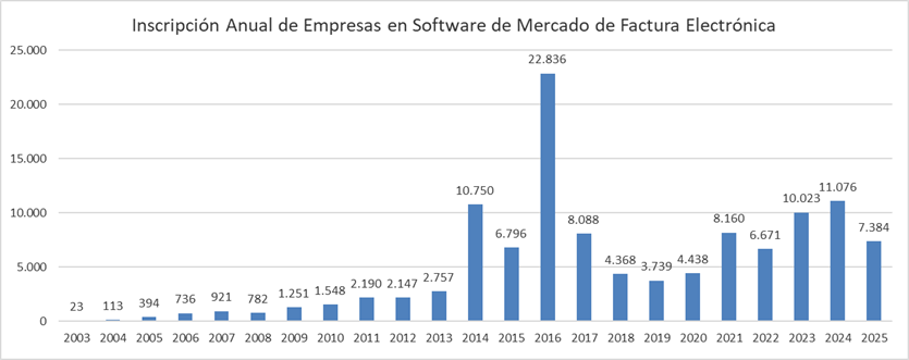 En el siguiente gráfico se muestra la cantidad de contribuyentes habilitados anualmente como emisores de factura electrónica a través de un software de mercado.