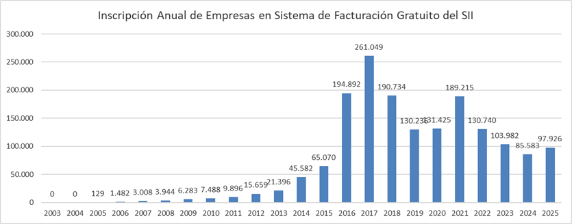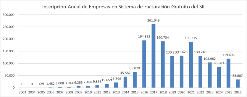 En el siguiente gráfico se muestra la cantidad de contribuyentes habilitados anualmente como emisores de factura electrónica a través del Sistema de Facturación Gratuito del SII.