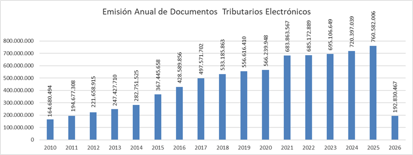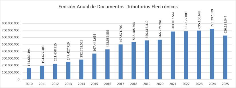 En el siguiente gráfico se muestra la cantidad de documentos tributarios electrónicos (DTE) emitidos anualmente. No incluye boletas electrónicas.