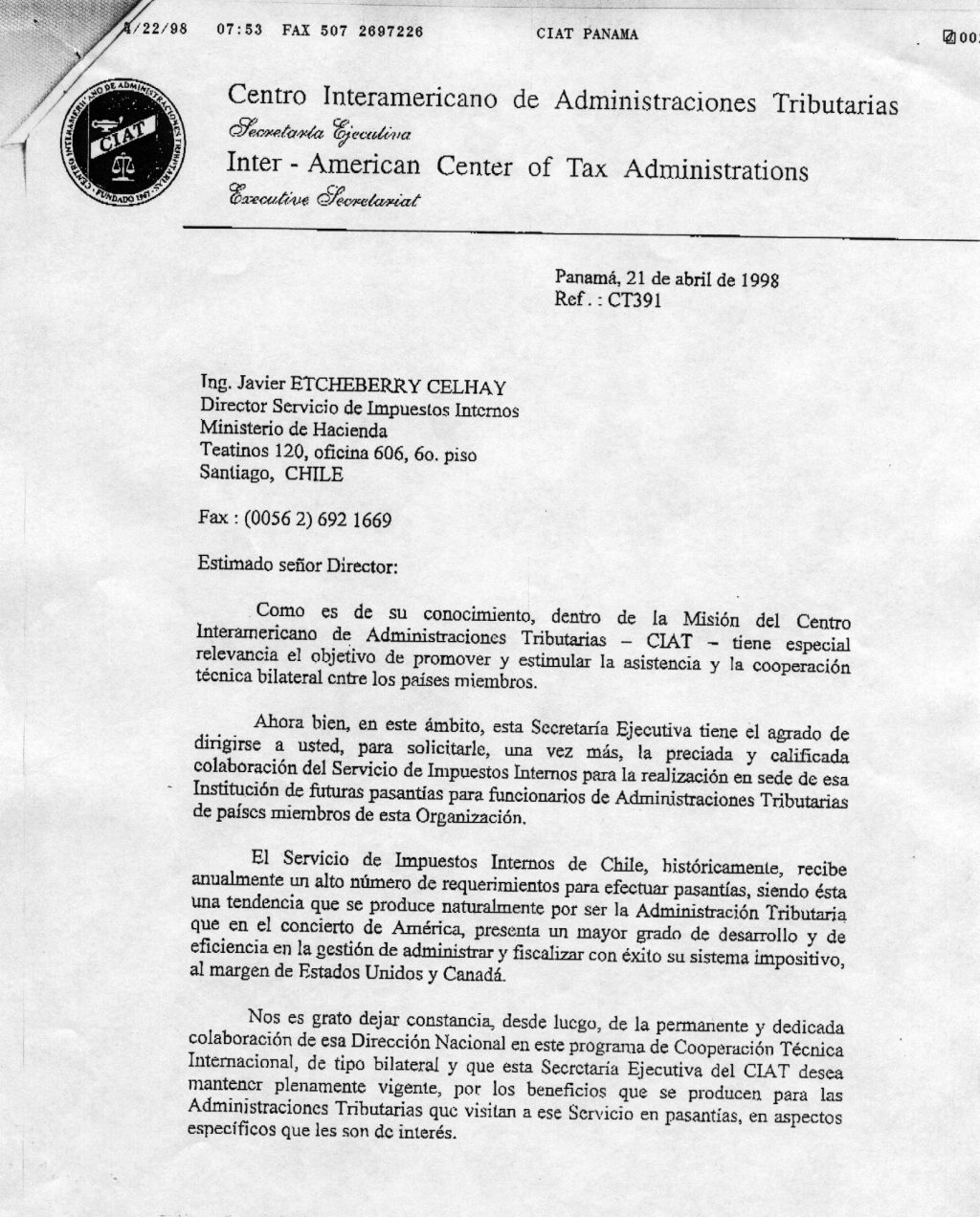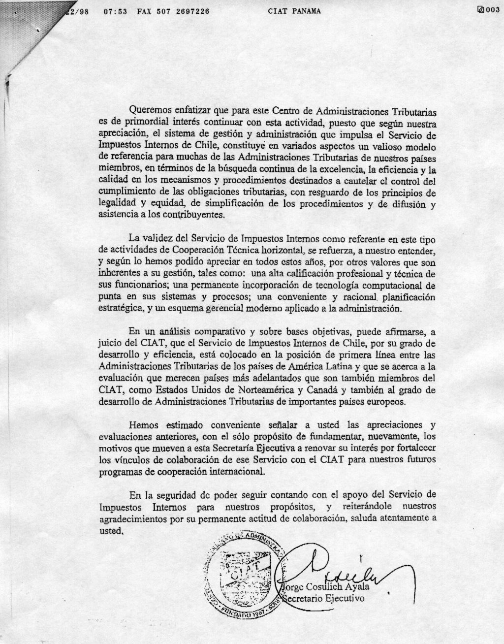 En las páginas siguientes, se puede ver copia de una carta de reconocimiento del CIAT a la labor del Servicio de Impuestos Internos: