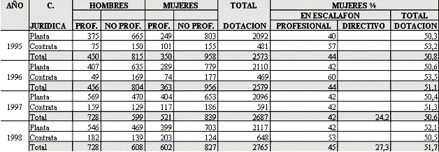 Analizando la situación por estamento y por escalafones, se puede constatar con respecto a los cargos directivos, que durante el año 1997 existían 31 mujeres en ese tipo de cargos sobre un total de 128 cargos de responsabilidad, lo que significa en términos porcentuales un 24,2 %. En el presente año (1998) esta cifra ha llegado a 35 mujeres ocupando cargos directivos sobre la misma base del año 1997 (128 cargos) aumentando a un 27,3 % la participación de éstas en los cargos directivos.